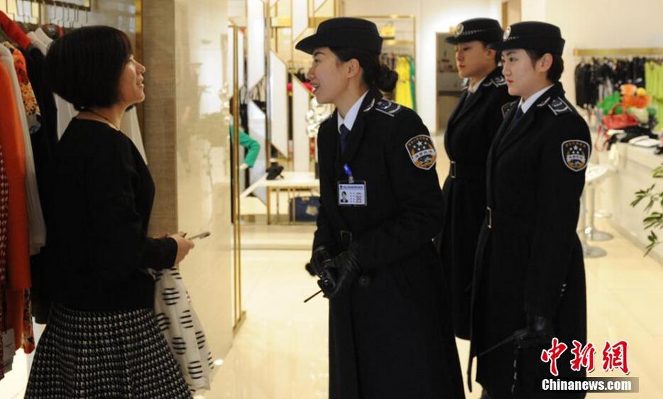 女子队员和商家沟通,微笑提醒注意事项。 杨艳敏 摄