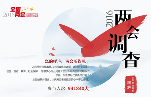 2月15日,2016年人民网两会调查上线,就公众关注的18个热点问题展开网上调查。这已经是人民网连续第15年推出两会调查。截至目前,“打虎拍蝇”暂居关注度排行榜第4位。