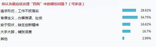 参与投票的网友认为,“四风”问题中最应该得到治理的问题是“官僚主义、办事推诿扯皮”(34.75%)。其他依次为“追求形式、工作不抓落实”、“大手大脚、铺张浪费”、“安于现状、缺乏创新精神”。
