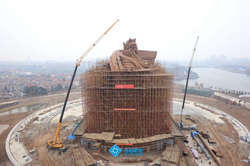 一座58米高、1200吨重的青铜雕像,外围层层脚手架正在被拆除,渐渐露出关公伟岸雄奇的真容。(云图航拍部 陈勇 赵融 任天祎 摄)