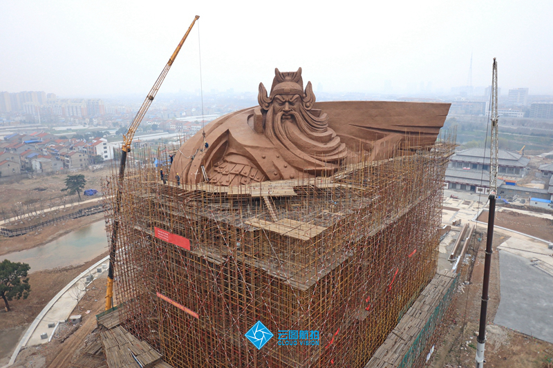 一座58米高、1200吨重的青铜雕像,外围层层脚手架正在被拆除,渐渐露出关公伟岸雄奇的真容。(云图航拍部 陈勇 赵融 任天祎 摄)