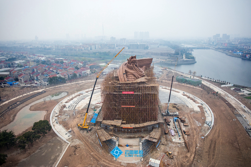 一座58米高、1200吨重的青铜雕像,外围层层脚手架正在被拆除,渐渐露出关公伟岸雄奇的真容。(云图航拍部 陈勇 赵融 任天祎 摄)
