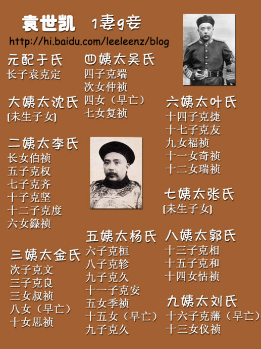 有一妻九妾,十七个儿子,十五个女儿。袁世凯死后,袁氏大家族陷入劫难,文革时期,一些袁氏后人甚至不敢姓袁,改为姓“周”和“方”——表示避难不忘祖,内心深处仍有一个“圆(袁)”。到了改革开放时期,袁氏家族又慢慢聚拢起来,这是一个庞大的家族。