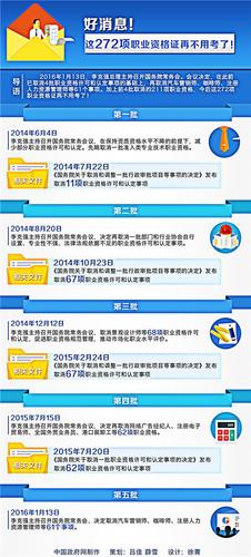 日前,国务院印发《关于取消一批职业资格许可和认定事项的决定》,取消61项职业资格证书。这已是国务院连续第三年第五批取消职业资格证。截至目前,国务院公布取消的职业资格证达到272项,超额完成本届政府确定的减少1/3职业资格的目标,标志着职业资格证集中清理工作基本完成。