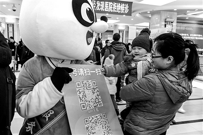 2月26日,北京儿童医院门诊大厅内,穿着卡通服装的工作人员向患儿家长讲解手机App、微信预约挂号方式。记者 张丹摄