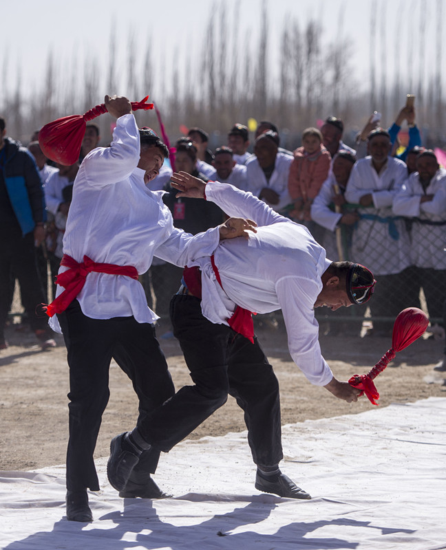 在新疆塔克拉玛干沙漠南缘的于田县,有两种传统民间游戏一直在民间流传。一种叫“牛肺拳击”,就是用白纱布裹着牛肺做成像拳头的样子互相击打对手后背,牛肺先破的人获胜。另一种叫“曲马克”,也叫“抹热球”,玩法与现代曲棍球相似,用根部弯曲的树枝做成球棍,击打不同材质的实心球。夜间还可以把球点燃,带着烟火击打。随着国家对民间文化的重视,“曲马克”已被列入新疆维吾尔自治区非物质文化遗产名录。