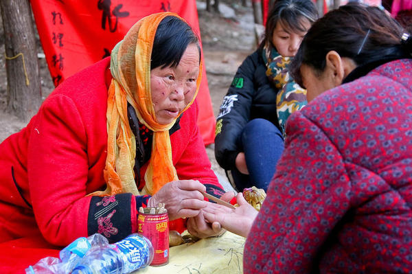 2016年3月1日,安徽宿州萧县圣泉寺景区内,20多个算命先生扎堆摆摊看相,一位妇女用利器把脸部戳烂,冒充麻衣神相招徕游客看相算命。