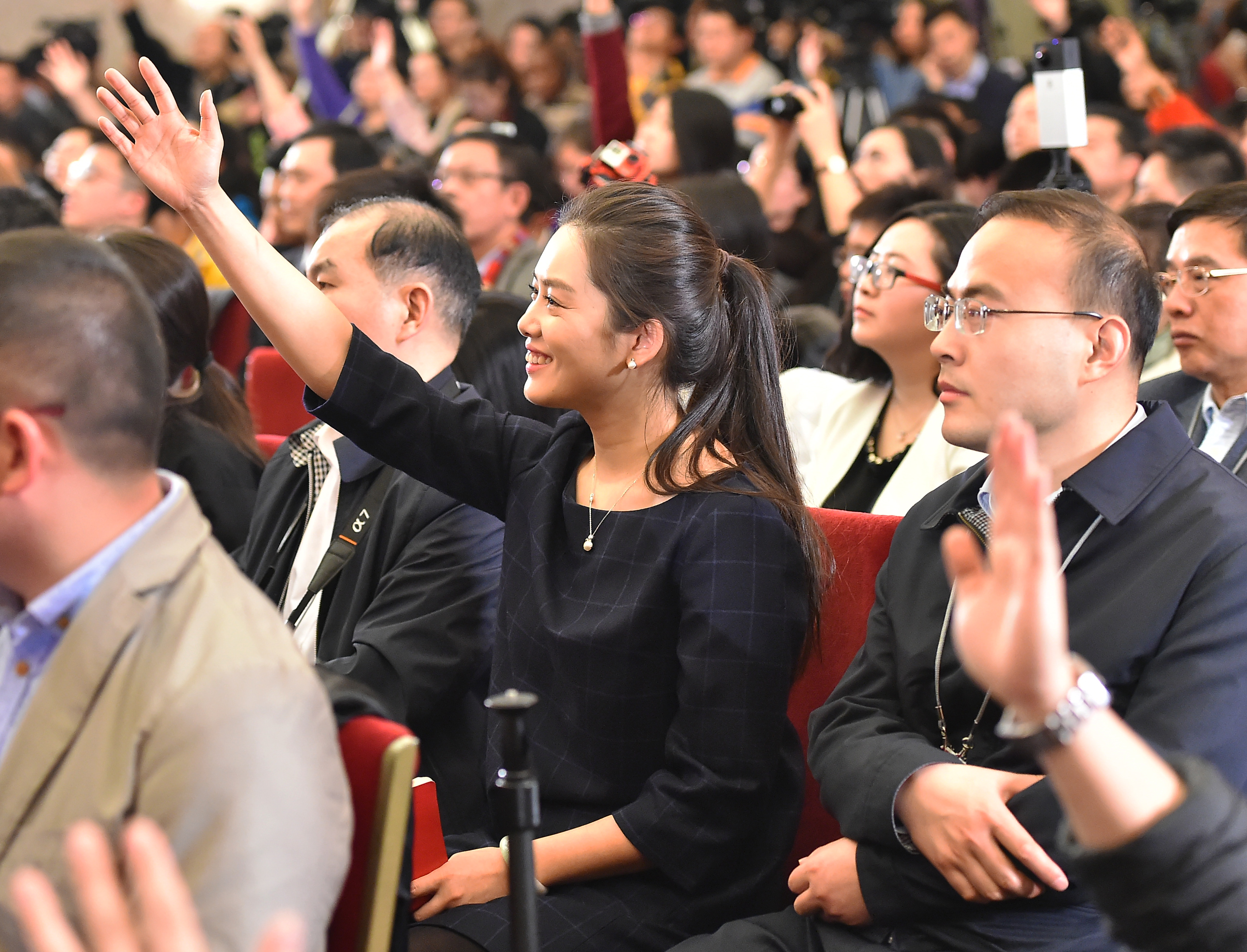 图为记者举手提问。人民政协网记者 贾宁 摄