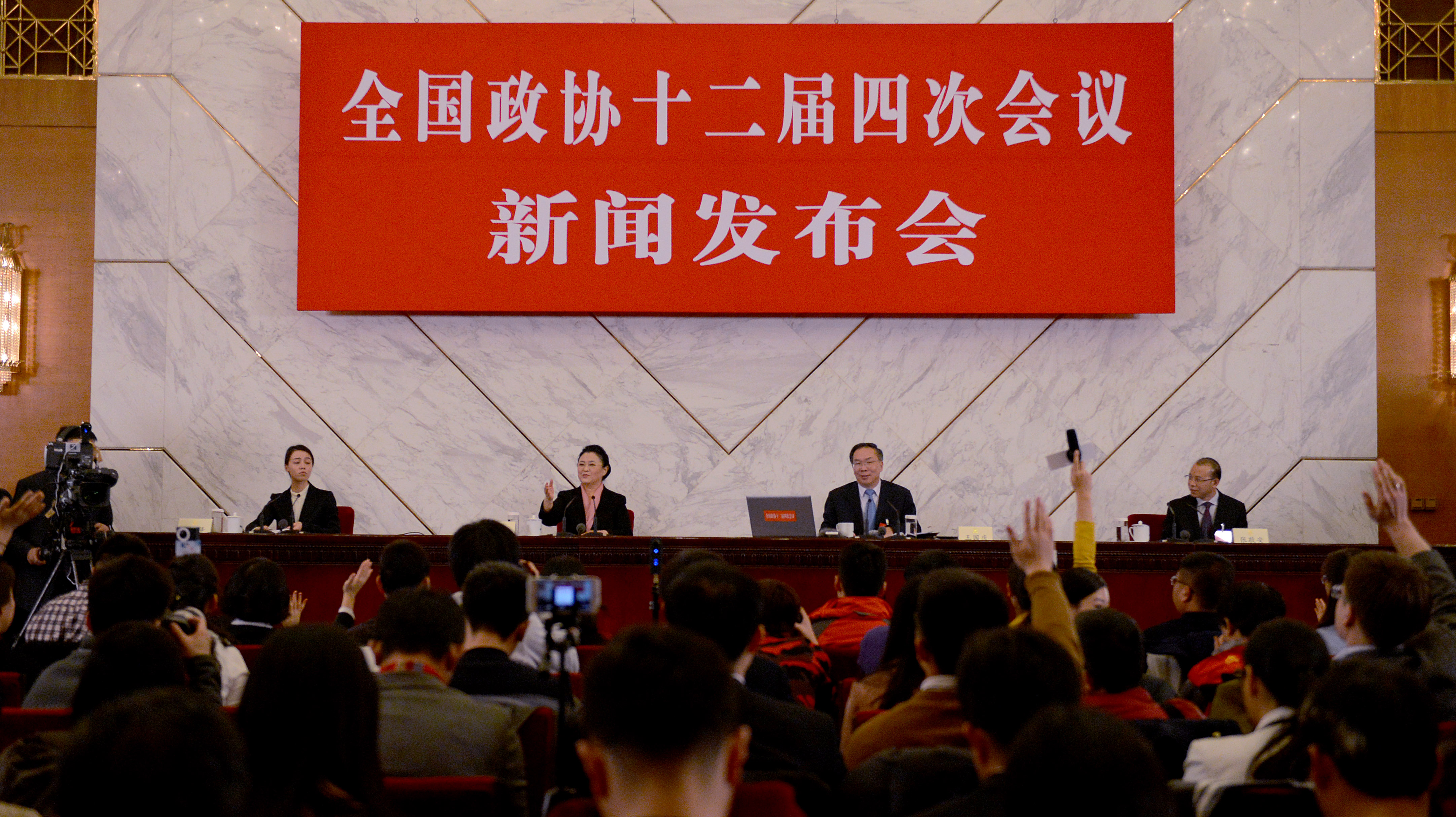 3月2日,全国政协十二届四次会议新闻发布会在北京人民大会堂举行,大会新闻发言人王国庆介绍会议有关情况并回答中外记者提问。图为新闻发言人王国庆回答记者问。人民政协网记者 田福良 摄