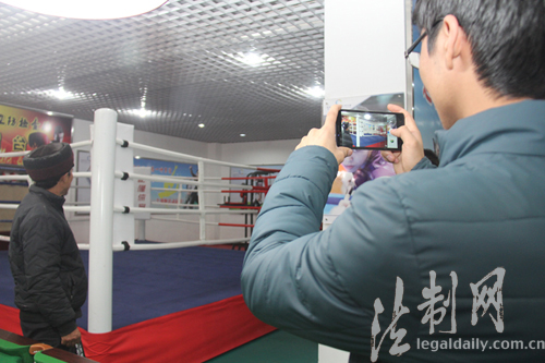 图为托合提瓦柯·塔力普参观边检站拳击台并拍照留念