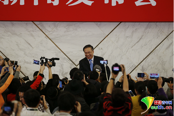 3月2日下午,全国政协十二届四次会议首场新闻发布会结束后,新闻发言人王国庆欲起身离开,随即被记者们团团围住。记者 张炎良 摄