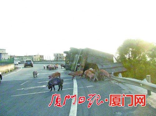 2日下午5时许,沈海高速泉州往厦门方向翔安出口匝道,竟有不少猪在“溜达”。原来是载猪的车子侧翻了,厦门高速交警支队民警与交通综合执法等部门联手快速处置,确保高速畅通。