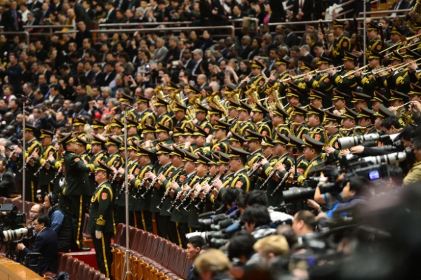 3月5日,第十二届全国人民代表大会第四次会议在北京人民大会堂开幕。这是军乐团高奏国歌。新华社记者刘军喜摄