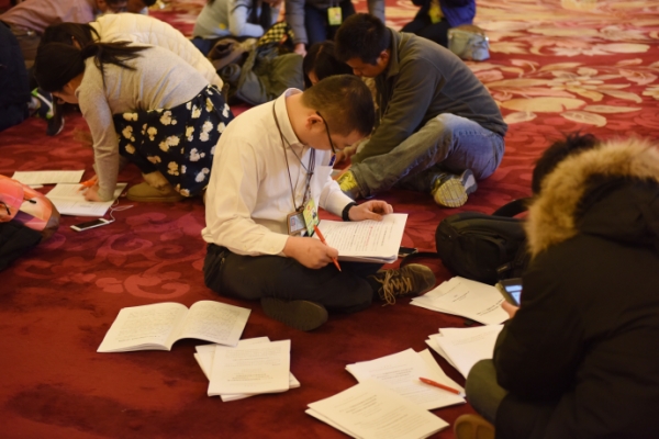 3月5日,第十二届全国人民代表大会第四次会议在北京人民大会堂开幕。这是记者在人民大会堂内领到政府工作报告后抓紧阅读。新华社记者薛玉斌摄