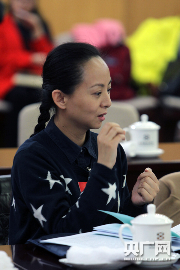 全国政协十二届四次会议文艺界别小组讨论会中,邰丽华委员通过手语翻译表达自己的观点(记者杨晓凡_摄)