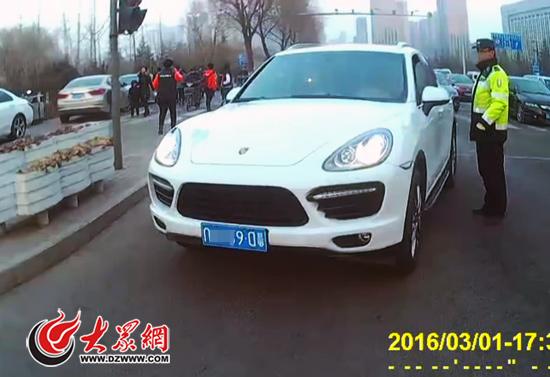 3月1日下午5点多,济南历下交警在龙奥南路执勤时,一辆白色保时捷SUV向西驶来。执勤交警瞟了一眼该车,发现前车牌有些不对劲:车牌居然是倒着挂的。随即,该车被交警拦停询问,驾驶员朱某某称自己没带驾驶证。