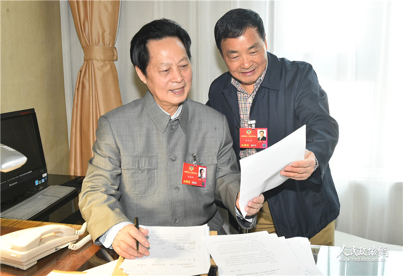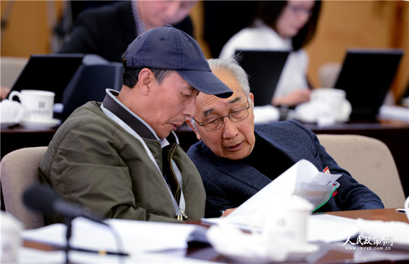 文艺界小组会上韩书力委员(左)和靳尚谊委员在交流。