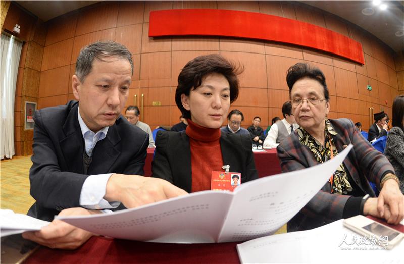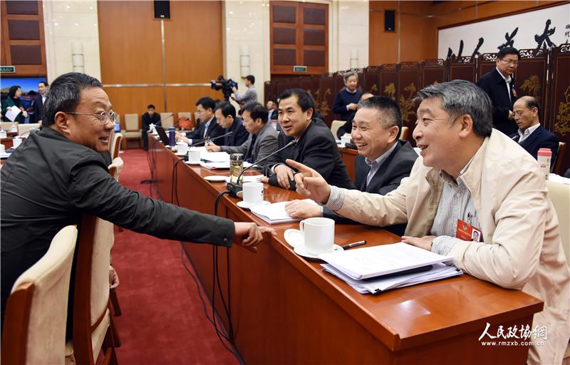 汪国新委员与徐安碧委员就政府工作报告交换意见。