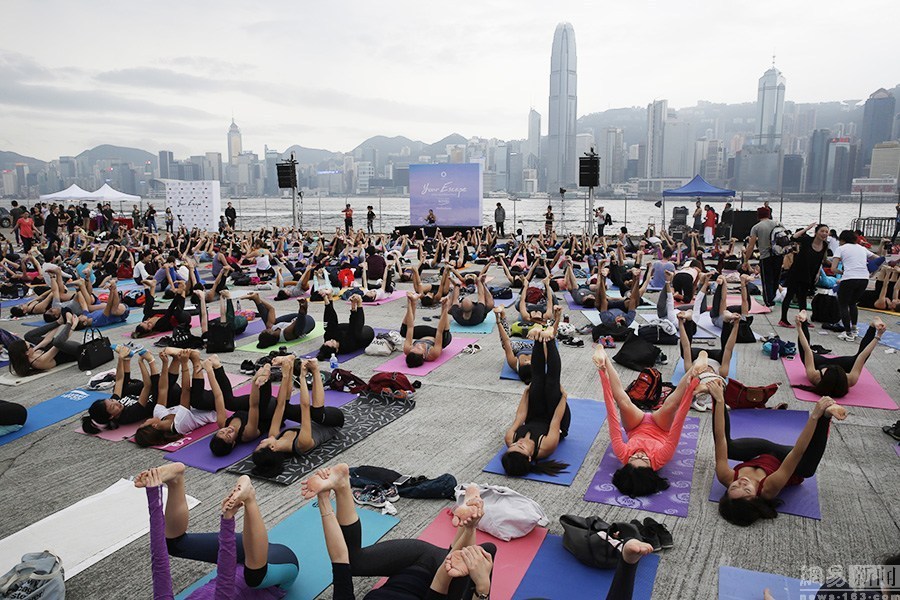 2016年3月5日,中国香港,美女在街头练瑜伽,大秀好身材。