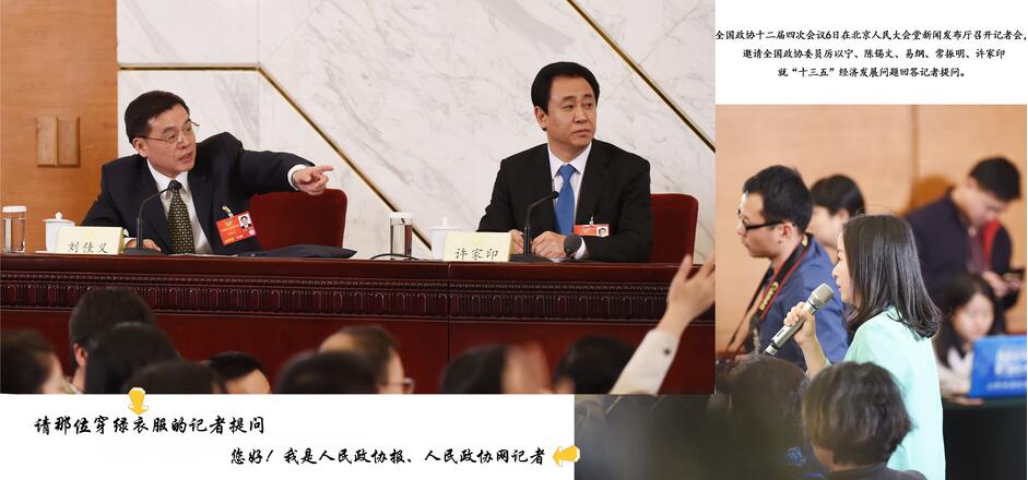 人民政协网北京3月6日电 全国政协十二届四次会议6日在北京人民大会堂新闻发布厅召开记者会,邀请全国政协委员厉以宁、陈锡文、易纲、常振明、许家印就“十三五”经济发展问题回答记者提问。图为人民政协报、人民政协网记者提问。