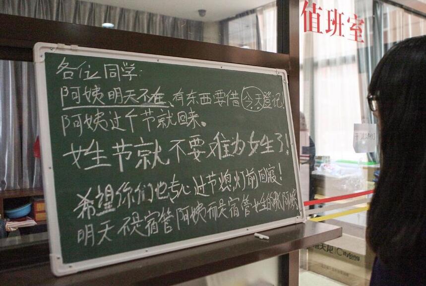 原标题:女生节横幅大比拼:宿管大妈不惜翘班去过节
