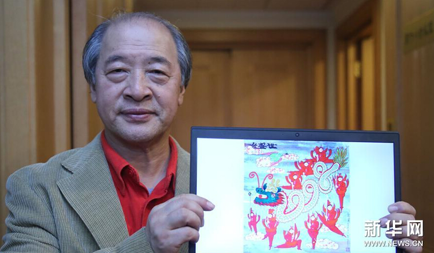3月4日,全国政协委员王书平展示自己农民学生李兆川的作品。65岁的李兆川创作的《女子舞龙迎奥运》获得了全国迎奥运农民画大赛的银奖