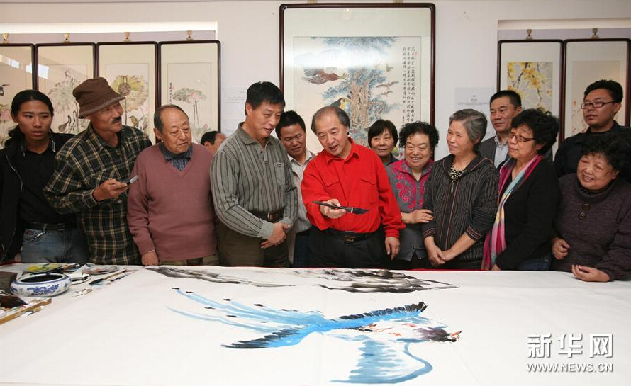 这是王书平(中)在天津市北辰区双街村的美术服务点指导农民学生绘画(2011年10月15日摄)。