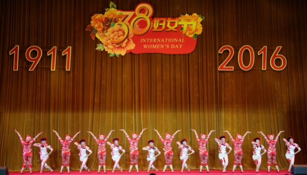 3月7日,演员们在招待会上表演《剪纸姑娘》。当日,纪念“三八”国际妇女节中外妇女招待会在北京人民大会堂举行。新华社记者 殷刚 摄