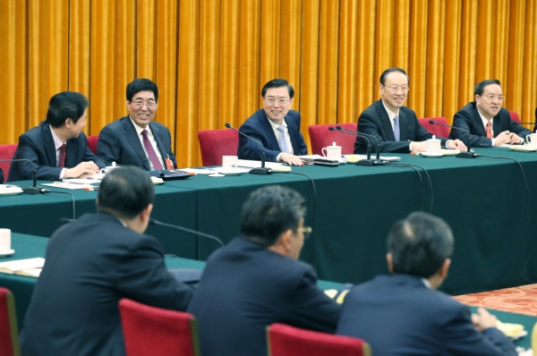 3月8日,中共中央政治局常委、全国人大常委会委员长张德江参加十二届全国人大四次会议吉林代表团的审议。新华社记者姚大伟摄