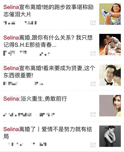 首先是用煽情的办法,把作者对事情的个人感受,通过移情的办法,与读者做心灵对接,“深夜在朋友圈得知Selina离婚的消息,简直不敢相信,这边电视上还谈笑风生,那边离婚声明看得我潸然泪下”。把对明星离婚事件的感受戏剧化,某种程度上也就是把离婚一事问题化。
