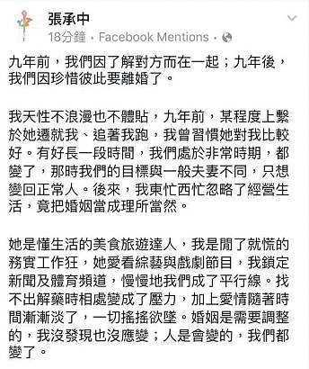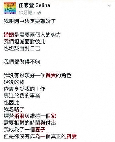 其实,我觉得Selina的离婚告示,在宣告自己“成长”的同时,也遵循了女性心灵鸡汤的某些书写套路。具体地说,她把婚姻出现“问题”,归咎于自己未能有扮演好“妻子”、“贤妻”的性别角色。但你在另一位当事人的反省里,是看不到对等词语“丈夫”的。