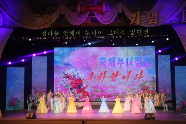 这是3月8日在朝鲜首都平壤拍摄的歌舞演出现场。