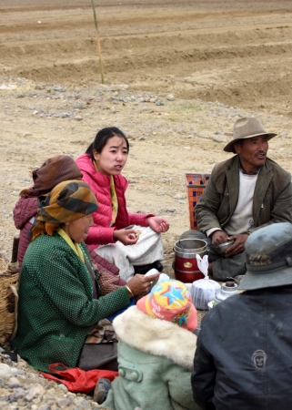 德吉央宗(穿红衣者)与村民在田间地头吃饭(2015年4月24日摄)。