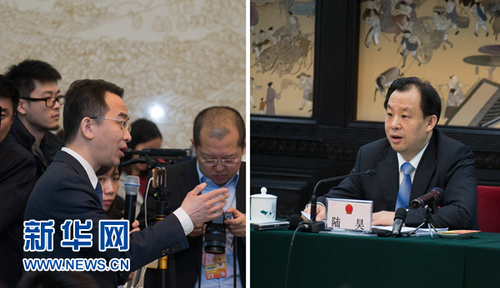 3月6日,在十二届全国人大四次会议黑龙江代表团媒体开放活动上,记者(左图)就“天价鱼”事件向全国人大代表、黑龙江省长陆昊提问。陆昊代表(右图)表示,“天价鱼”事件并不是偶然的,说明有相当一部分基层干部和企业经营者,在社会监督、舆论监督方面的意识不够;真正理解法律、制度、规则、信用方面的意识不够。事情出来了不是坏事,对黑龙江市场经济的发展来说,是一次进行深刻反省的机会。新华社记者吕迅摄(拼版照片)