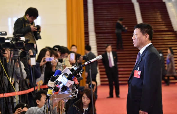 3月9日,十二届全国人大四次会议在北京人民大会堂举行第二次全体会议。这是会前,人力资源和社会保障部部长尹蔚民接受媒体记者采访。新华社记者 赵颖全 摄