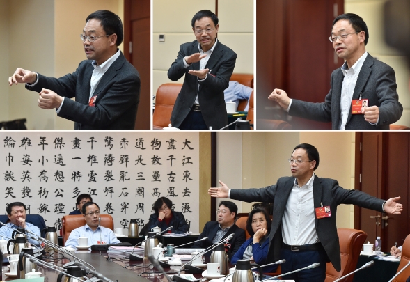 3月9日,全国政协委员、中国科学院院士武向平在政协小组讨论会上阐述建议时以通俗的语言和形象的动作向大家介绍关于“引力波”的科普知识,引起现场委员们的关注。新华社记者 李贺 摄