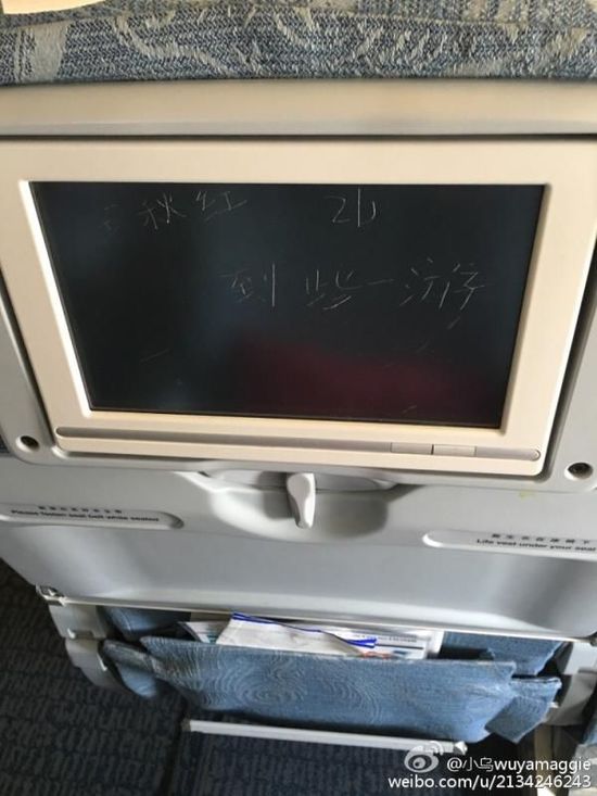 3月7日,网友“小乌wuyamaggie”发微博称:“国航777被人刻上‘到此一游’。知道公司要损失多少钱么?”该网友还附上2张照片,分别是液晶屏幕的特写和液晶屏幕加座椅后背的全景。特写照片显示,液晶屏幕上??绦醋拧巴跚锖?到些一游”的字样。其中的“些”字应为“此”字。该微博被大量转发后,网友们纷纷发评论声讨。澎湃新闻记者从国航方面了解到,该公司正在对此事排查。