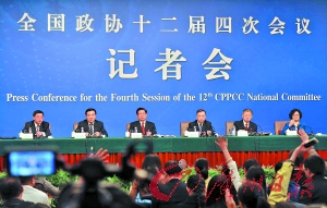 全国政协十二届四次会议记者会在北京梅地亚两会新闻中心召开,主题是“政协委员谈惠及民生共享发展”,邀请5位全国政协委员回答记者提问。 广州日报记者黎旭阳、庄小龙摄