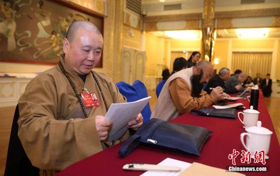 3月5日,全国政协委员、上海玉佛寺方丈觉醒在北京参加全国政协十二届四次会议分组会议。中新社记者 汤彦俊 摄