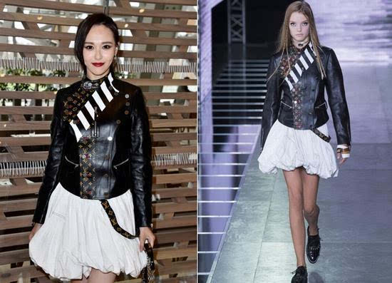 此次时装周唐嫣保持了其一贯的穿衣水准,没进步也没退步。印花皮夹克搭配白色褶皱半裙,虽然造型不如冰冰惊艳,但也还说得过去。
