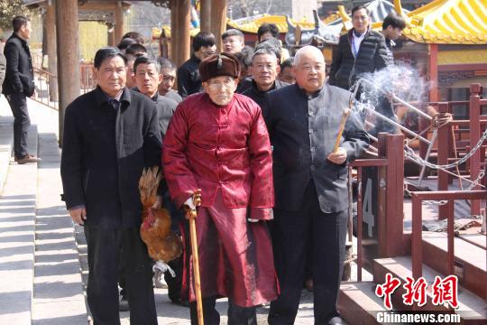 10日,运河沿岸18市在台儿庄举办开河大典。101岁的运河老船工徐德光应邀担任丙申年“二月二”运河开河大典的主祭人。 曾洁 摄