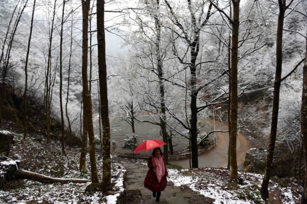 3月10日,一名游客在浙江省磐安县山区游览。