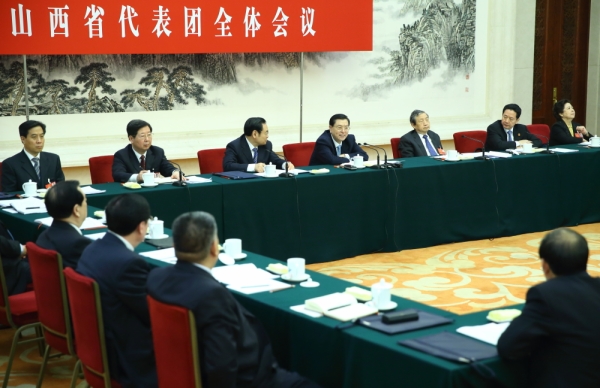 3月10日,中共中央政治局常委、全国人大常委会委员长张德江参加十二届全国人大四次会议山西代表团的审议。 新华社记者丁海涛摄