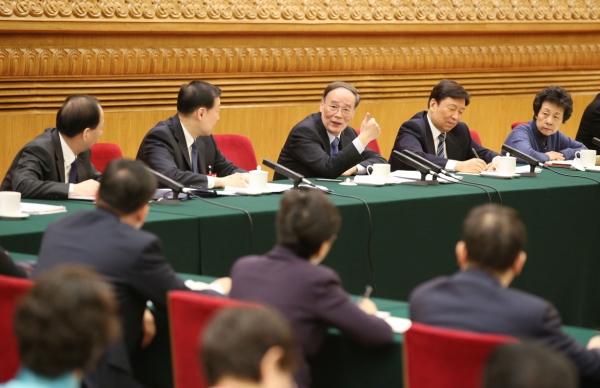 3月10日,中共中央政治局常委、中央纪委书记王岐山参加十二届全国人大四次会议江苏代表团的审议。 新华社记者姚大伟摄