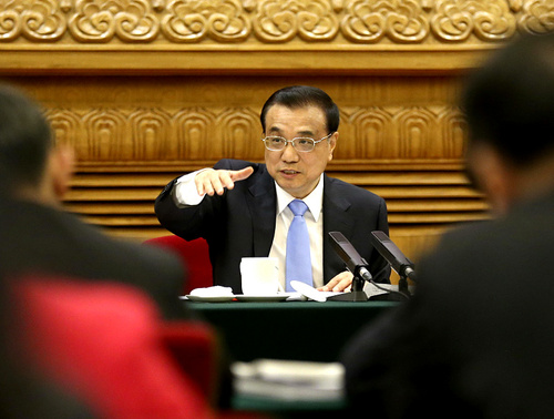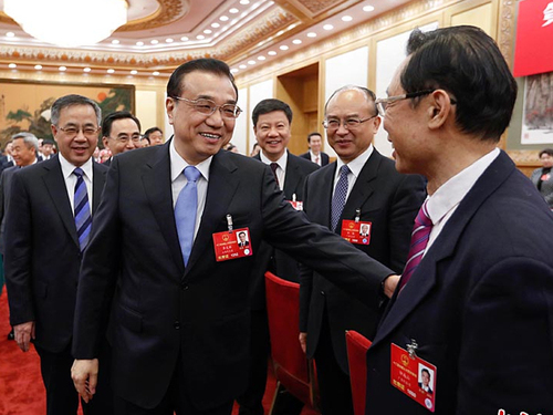 3月9日,中共中央政治局常委、国务院总理李克强参加十二届全国人大四次会议广东代表团的审议。李克强同全国人大代表、中国工程院院士钟南山交流。中新社记者 刘震 摄
