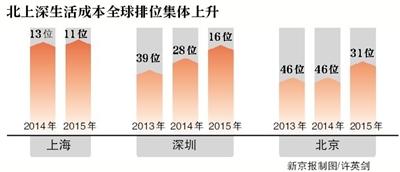 新京报讯 (记者李春平)经济学人智库昨日发布最新的2015年全球生活成本调查。调查显示,上海的生活成本已与东京比肩,北京、深圳的生活成本在全球的排名也大幅提升。