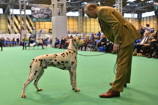 3月10日,在英国伯明翰,一名狗主人和他的大麦町犬参加克鲁弗兹狗展首日的活动。