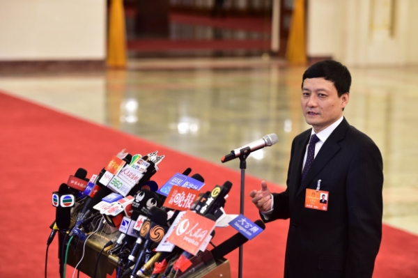 3月13日,十二届全国人大四次会议在北京人民大会堂举行第三次全体会议。这是会前,国资委主任肖亚庆接受媒体记者采访。新华社记者 刘军喜 摄