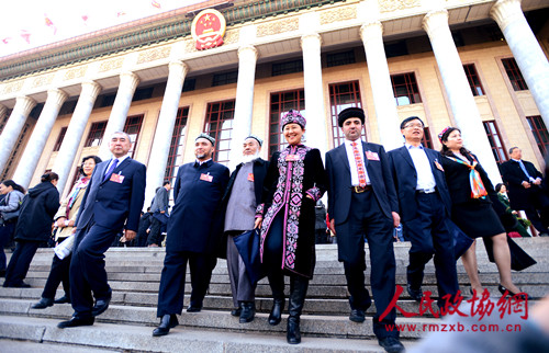 图为全国政协十二届四次会议闭幕后,少数民族委员们走出大会堂。田福良 摄影报道