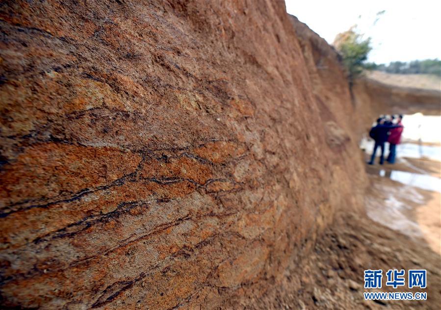 3月15日拍摄的古代水利工程的堤坝部分,关键部位以“草裹泥”工艺堆垒加固(黑色细条为草碳化后的痕迹)??脊叛д呓招?,浙江省杭州市西北郊发现了中国已知最古老的大型水利工程,距今已有约5000年历史。这处水利工程位于余杭区瓶窑镇境内。80年前,在当地的良渚,考古学者发现新石器文化遗存良渚文化。新华社记者 王定昶摄